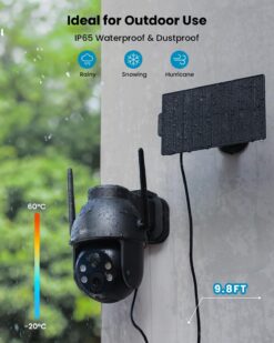 Caméra de surveillance extérieure 3K/5MP ultra-haute définition en finition noire élégante avec rotation motorisée 360° PTZ (Pan 355° + Tilt 120°). Alimentée par panneau solaire 3W et batterie 5200mAh. Vision nocturne couleur jusqu’à 15m avec zoom numérique 4X. Détection humaine IA avec alertes en 1,5s. 100% sans fil, sans abonnement – la solution complète pour surveiller l’intégralité de votre propriété avec discrétion.